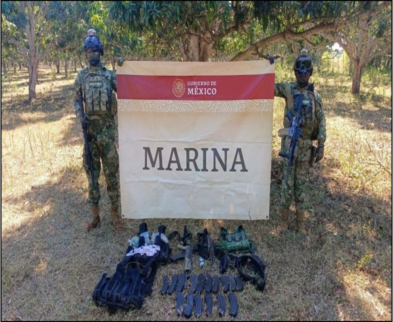 -En el municipio de Tecuala, personal de la Secretaría de Marina (Semar), mediante trabajos de inteligencia, aseguraron cuatro bolsas de marihuana, metanfetamina, dos armas largas, 510 cartuchos útiles, 18 cargadores y tres chalecos tácticos, en inmediaciones del poblado El Novillero.