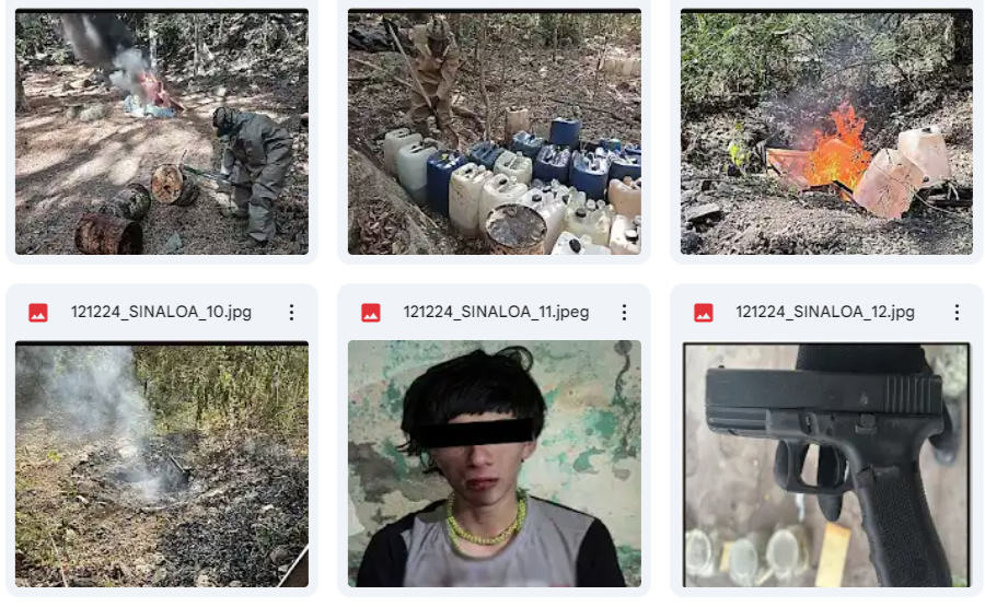 -En Culiacán y Elota, Sinaloa, mediante trabajos de inteligencia, elementos del Ejército inhabilitaron tres áreas de concentración de material diverso para la elaboración de metanfetamina, donde aseguraron 2,350 litros y 70 kilos de sustancias químicas.